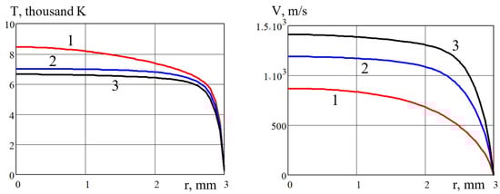 Distribution of temperature (left) and plasma velocity (right) in the outlet section of the arc plasma torch under different modes of its operation: 1—G = 0.75 g/s; 2—G = 1.0 g/s; and 3—G = 1.4 g/s.