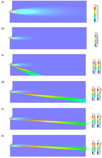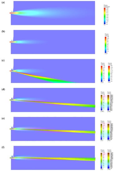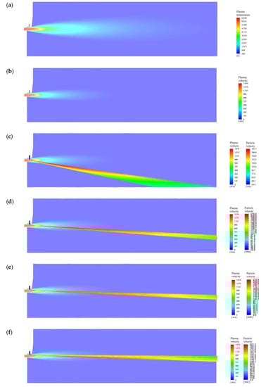Results of the 3D calculation of the fine powder motion in the plasma jet at a plasma-forming gas flow rate through the plasma torch of 1.0 g/s: (a)—temperature distribution of the plasma jet without powder supply; (b)—velocity distribution of the plasma jet without powder supply; (c–e)—distribution of the plasma velocity and the velocity of the powder particles at different initial velocities of particles (c)— = 34 m/s; (d)— = 17 m/s; €— = 10 m/s; and (f)— = 3 m/s).