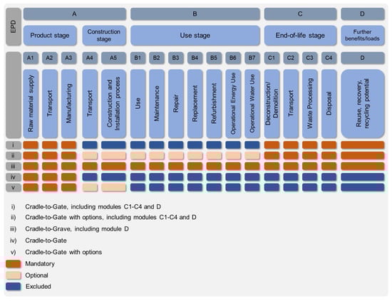 Building Life Cycle stages and modules with respective conformity to EPD system boundaries according to ISO 21930 and EN 15804 [25,26].