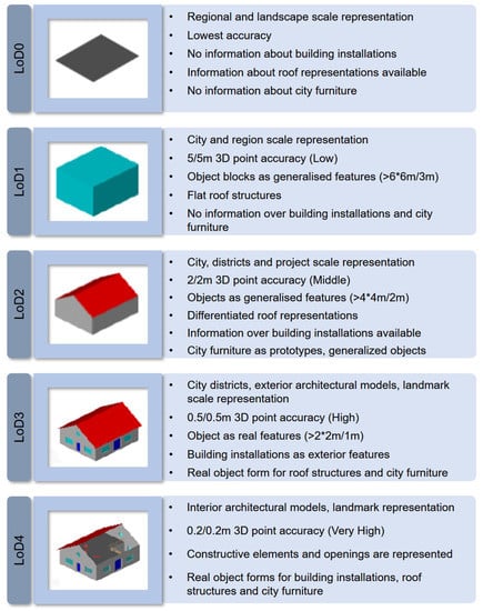 The LCI of buildings and districts necessitates a broad range of information on materials and elements used in the construction of a building to determine the input and output flows (see Section 1.1.1). This information is usually saved in a geometric or Building Information Modelling (BIM)-based model. However, there is a general lack of publicly available, highly detailed building or district models due to data privacy concerns, and arduous data acquisition. [32]. Yet, Geographical Information System (GIS)-based buildings’ geometrical data are widely available. This includes City Geographical Markup Language (CityGML) [33], Geo Javascript Object Notation (GeoJSON) [34], ESRI File GeoDataBase (ESRI File GDB) [35], Geo Javascript Object Notation (GeoJSON) [36], and Shapefile [37]. CityGML is the most frequent encoding standard of publicly available GIS-based building data used in the field of Urban Building Energy Modelling (UBEM) [38], and is the focus of the presented research. The standard introduces a Level Of Detail (LoD) concept of buildings, whereby the amount of information in a CityGML model increases with the LoD of the buildings. Note that this contribution focuses on CityGML version 2.0, whereby version 3.0 has been published already [39]. Figure 3 gives an overview of the LoD concept [40]. Note that CityGML-based building data are generally available in LoD1 and LoD2 in Germany and Europe [33,38]. To enhance the usability of CityGML models for urban-scale building and energy network simulations, the Energy Energy Application Domain Extension (ADE) and Utility Networks ADE have been developed [41,42]. In particular, the current version of Energy ADE 2.0 extends the CityGML standard with classes and attributes related to building physics and patterns of occupancy [38].