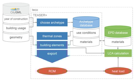 This section describes Teco [95], a heuristic approach to determine the life cycle inventory and assess the environmental impact of large building stocks implemented in Python and Modelica. It is based on the Tool for Energy Analysis and Simulation for Efficient Retrofit+ (TEASER+) [40,96], an enrichment framework for UBEM, and therefore extends its classes for LCA calculations. Teco and TEASER+ are available as open source under the MIT license. (https://github.com/RWTH-E3D/Teco/tree/EnergiesSpecialIssue23 and https://github.com/RWTH-E3D/TEASERPLUS, accessed on 18 July 2023).