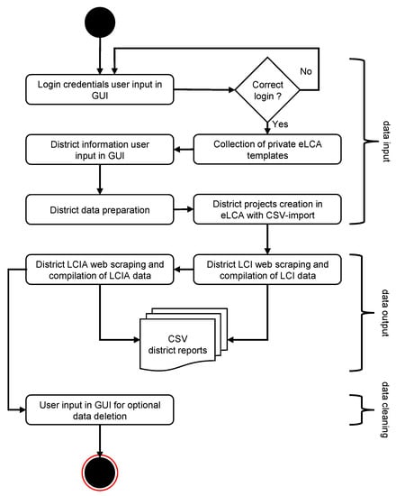 DisteLCA evolved from another eLCA automation developed by the authors, comparing the impact of various renovation options for different building archetypes on a district level. A programme modification was necessary, as district LCA focuses on analysing existing buildings rather than comparing remediation alternatives. DisteLCA has been developed by some of the authors involved in this contribution and is available open-source. The underlying architecture of eLCA (or “bauteileditor”) is the result of a research project conducted by BBSR [104,105]. Figure 5 illustrates a UML activity diagram of the developed automation.