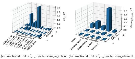 This section describes Teco’s and DisteLCA’s output with regard to the functional units and impact categories (see Figure 1). The full raw output can be found in the repositories. (https://github.com/RWTH-E3D/Teco/tree/EnergiesSpecialIssue23 and https://github.com/RWTH-E3D/DisteLCA/tree/EnergiesSpecialIssue23, accessed on 18 July 2023). Values for stage D are depicted as absolutes in all figures and tables unless stated otherwise. Note that DisteLCA explicitly models life cycle module B4, whereas, in Teco, material replacements are considered in each relevant stage. Figure 9 gives an overview of the functional unit results. In alignment with the amount and types of buildings outlined in Section 2.3, district 3 shows the highest amount of NLA and building element area. It is also the only district to have buildings from all building age classes. In contrast, district 1 only has buildings from the newest typology class, and district 2 from classes 1949 to 1957, and 1958 to 1968. As could be expected, the large amount of MFH in urban district 3 leads to a high proportion of floor area.