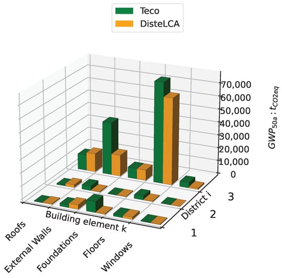 Figure 10 provides an overview of per building element. Note that stage D has been omitted for this representation since DisteLCA is incapable of issuing information on this model on a building element level. Furthermore, in light of DisteLCA’s results for stage B (see Table 3), the operational energy use is not part of the figure for visual clarity. Teco is prone to give higher outputs for all elements and districts, with the exception of roofs, and external walls in district 1.