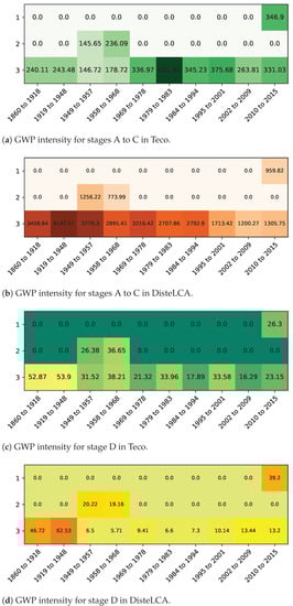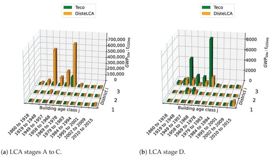 Figure 11 shows the per age class in each district. There is a clear tendency for Teco to give much lower results than DisteLCA for stages A to C (Figure 11a). However, the former tool generally determines a higher net benefit of stage D (Figure 11b). The GWP intensity per for each building age class and district is illustrated in Figure 12. For stages A to C combined (see Figure 12a,b), Teco outputs far lower results than DisteLCA. Moreover, both tools yield divergent peak GWP intensities for districts 2 and 3. A similar pattern can be observed for stage D (see Figure 12c,d), albeit Teco’s output values are mostly higher. The results show a general pattern. Teco tends to give higher estimates for stages A, C, and D separately, while DisteLCA tends to output lower values. However, DisteLCA produces far higher results for stage B than Teco for all examples. It should be noted that the ISO 14040 framework has been fully applied to the presented scope (see Table 1, Section 2.3). Yet, the EPD datasets provided by ÖKOBAUDAT sometimes lack specific stages of a Cradle-to-Gate scope such as modules C1 (Deconstruction/Demolition) and C2 (Transport). Analogously, neither tool produces output with regard to these modules. Teco’s distribution of replacements effectively omits phase B4 in the output.