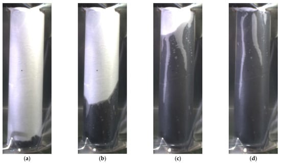 Figure 3 shows an example of the wetting process for the separator and anode #2 winding at t = 1, 7, 45, and 72 s. The wetting progress is evident from the contrast to the white separator. Additionally, in Figure 3b,c, a partial grayscale is observed at the transition between the wetted and unwetted materials. Here, wetting at the interface between the two materials has to be expected. The subsequent complete impregnation of the separator results in a black coloration of the separator. In Figure 3c,d, the remaining gray areas can be seen. Here, wetting either does not occur or takes place very slowly. This is likely due to variations in pore radii, resulting in slower wetting rates. These effects were observed in all three experiments. To evaluate the images, a small image section with a width of 45 pixels and the entire height in the center of the coil was selected in all cases to minimize the effect of rounding. For the image evaluation, a gray-colored pixel is considered as wetted, allowing for the quantification of the fastest possible wetting of the materials. It is important to note that one pixel corresponds to 53 µm in the evaluated images.