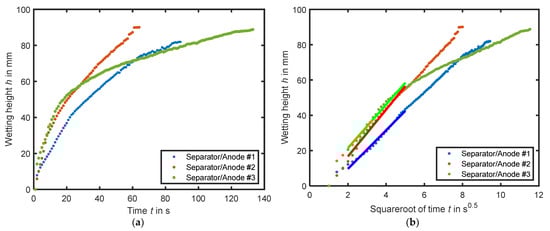The Lucas–Washburn equation describes the capillary rise in porous media, such as an electrode [30]. This equation is usually modified and simplified to describe the height increase of the infiltrating liquid using a wetting rate k [mm · s−0.5] [9]: