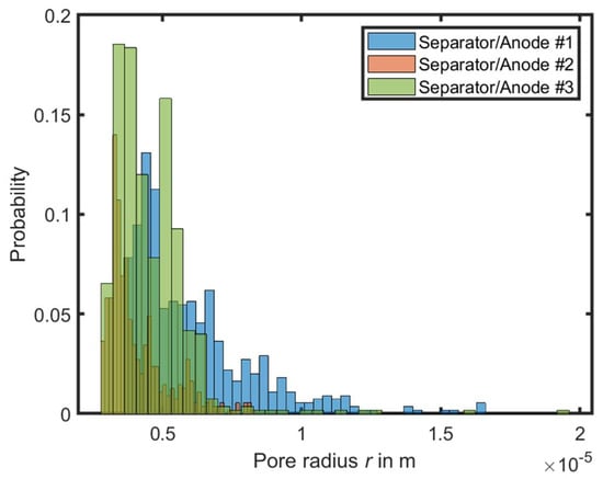 The resulting pore size distribution corresponds to a normal distribution with the following values and is comparable to the optical analysis of the microscopy images. A normal distribution can be determined based on this pore size distribution. This is 6.05 µm (σ = 2.2 µm) for separator/anode #1, 4.1 µm (σ = 1.13 µm) for separator/anode #2, and 4.58 µm (σ = 1.47 µm) for separator/anode #3. The pore size distribution closely aligns with the average pore radii of the individual anodes measured from the microscopy images. However, it does not precisely match the calculated pore radii of the experiments. Despite this, the measured pore radii are also included in the distribution, particularly for experiments #1 and #3.