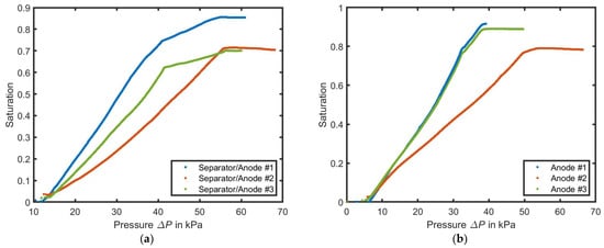 In Figure 6b, when only the electrodes are simulated under the same boundary conditions but with individual contact angles, differentiated wetting curves can be observed. Anodes #1 and #3 exhibit an almost simultaneous wetting between 5.21 kPa and 38.4 kPa, which differs only in the final saturation of the geometries. However, anode #2 shows a slower increase in wetting between 6.3 kPa and 53.5 kPa and reaches gas entrapments of 21%. The wetting time required to reach 50% wetting is 11 ms for anode #1, 19.1 ms for anode #3, and 12.1 ms for anode #2. Using Equation (3), it can be inferred that an increasing differential pressure corresponds to smaller pores. With a maximum differential pressure of 53.5 kPa of anode #2 and 38.4 kPa of anode #3, pore sizes of 1.15 µm and 1.65 µm can be calculated, respectively.