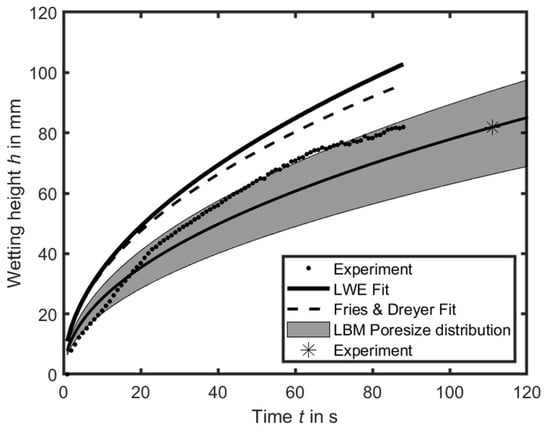 In the experiments, the two equations of Lucas Washburn and the modification of Fries and Dreyer are used to reproduce the wetting behavior. Figure 7 illustrates that the simulation of wetting, based on the Fries and Dreyer modification, more accurately reproduces the experimental wetting for the same pore radius.