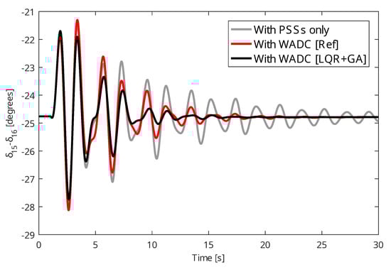 The WADC projected by linearized models will be analyzed through the application of contingencies in the dynamic nonlinear model of the test system. A three-phase fault of 100 ms was applied to bus 14 and the angular responses of the generators were comparatively evaluated without the presence of the WADC, the WADC designed by the proposed method, and the WADC designed by the method in [51]. Figure 1, Figure 2 and Figure 3 present the angular responses of generator 14 for the C2 case (see Table 1) to the WADC operating with all communication channels, the loss of the signal from machine 14, and the loss of the WADC control signal that goes to the comparator of the AVR of machine 5. Figure 4, Figure 5 and Figure 6 present the angular responses of machine 15 for the C3 case (C2 case with the disconnection of transmission lines 31–53) to the WADC working with all communication channels, the loss of the speed signal from machine 14, and the loss of the WADC control signal that goes to the comparator of the AVR of machine 5. In all cases shown, the angular responses of the test system with the WADC (LQR + GA) designed by the proposed method showed a well-damped behavior and with low amplitudes when compared to the method proposed in [51] (WADC (Ref)) and the system operating only with PSSs.