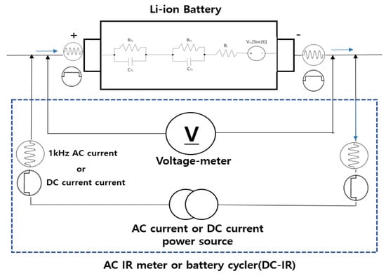 9]. The mechanism of AC IR measurement calculates the internal resistance based on the voltage measured at the battery terminals by inputting AC with 1 kHz frequency to the battery. The mechanism of DC IR measurement calculates the internal resistance based on the voltage variation by inputting DC for a constant time interval. Furthermore, in order to evaluate the internal resistance of a battery based on the abovementioned mechanisms, this paper implements a test device for the measurement of battery cells, which is composed of an AC and DC power source section, a sensing section, and a lithium-ion battery cell. Another test device is also implemented for the measurement of battery packs, which consists of an AC and DC power source section, a sensing section, and a lithium-ion battery pack containing cells, fuses, relays, and a battery management system (BMS). As a result of the evaluation of the internal resistance of the battery cells and pack according to various scenarios based on the proposed mechanisms and test devices, it is confirmed that the DC IR measurement is more effective in measuring resistance characteristics by the SOH than the AC IR measurement, while the AC IR measurement is more effective in evaluating characteristics of internal resistance due to the degradation of connections in the battery than the DC IR measurement.