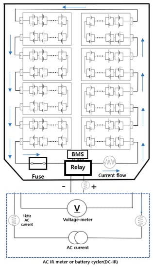 Figure 7, the internal resistance test device for medium and large battery packs is composed of an AC and DC power source section, a sensing section, and a battery section containing lithium-ion battery cells, fuses, relays, and a BMS. The device is configured to supply current to the positive and negative terminals connected externally to the battery pack to measure internal resistance with the voltage variation. In addition, unlike the battery cell test device, battery pack level internal resistance measurements can detect degradation of the battery cells as well as abnormality in the battery current path because the supplied current from the power source passes through connections, relays, and fuses in the battery pack. There are numerous junctions inside the battery pack for electrical connections, the defects of which can appear as internal resistance due to connection degradation. In addition, not only the resistance characteristics of battery cells but also connection points and other components can be affected by operation conditions such as temperature. Therefore, in this paper, the internal resistance of the battery pack is evaluated based on parameters such as the SOC, SOH, and temperature to assess the performance and safety of the battery pack.