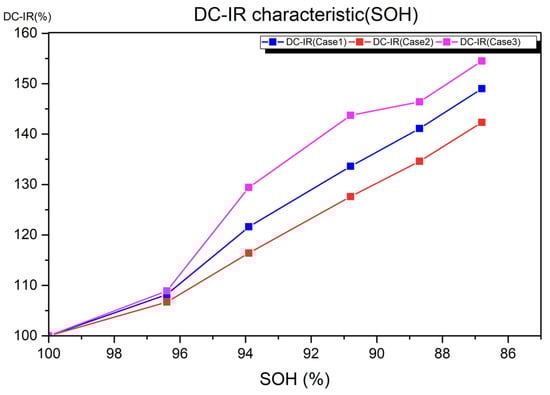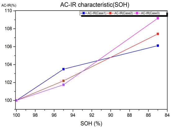 Figure 8. Regarding the batteries for EVs on the basis of reference value of a 100% SOH, it is found that the AC IR measurements tend to increase as the SOH decreases. It is confirmed by AC IR measurements that internal resistance increases as the battery cell degrades and the AC IR measurements increase by around 7% from the initial value according to the degradation progress.