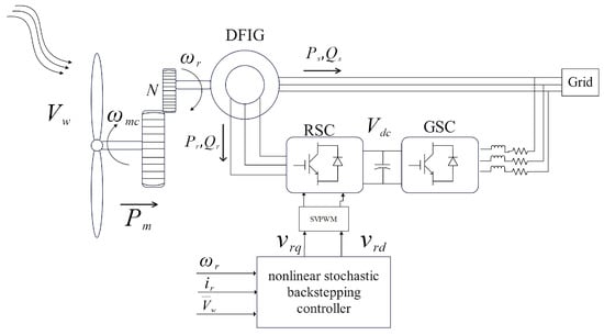 Over the past decade, there has been extensive research on the modeling and control of DFIG-WT. This system has strong nonlinearities due to the aerodynamics of wind turbines, the coupled dynamics of the DFIG and wide operation in the stochastic wind speed. Direct power control (DPC) of DFIG-WT systems has been proposed in [1,2] and developed in [3,4]. An adaptive compensation control with quasi-synchronous rectification algorithm is first proposed to track maximum power in [5]. Furthermore, in [6], Xiong, LY proposes a novel sliding mode control technique for DFIGs based on the fast exponential reaching law to track active/reactive power. Model predictive control is developed for the rotor-side converter (RSC) in [7]. Predictive rotor current control is developed under unbalanced and distorted grid conditions in [8] to control the output active/reactive power robustly. Fariba Fateh [9] utilizes feedback linearization to assume that the power capture coefficient and the desired rotor speed are instantaneously identified for tracking maximum power. However, all the above articles study deterministic systems. Several researchers study stochastic systems in which DFIG-WT is affected by the stochastic wind, such as in reference [10], who combine the conventional optimal torque control algorithm with the Fokker–Planck–Kolmogorov equation solved by the linear least square method to make the PDF shape of the rotor speed track the desired PDF shape as accurately as possible. Additionally, the work in [11] presents a new stochastic predictive control approach for variable-speed wind turbines to capture maximum power under the rated wind speed.