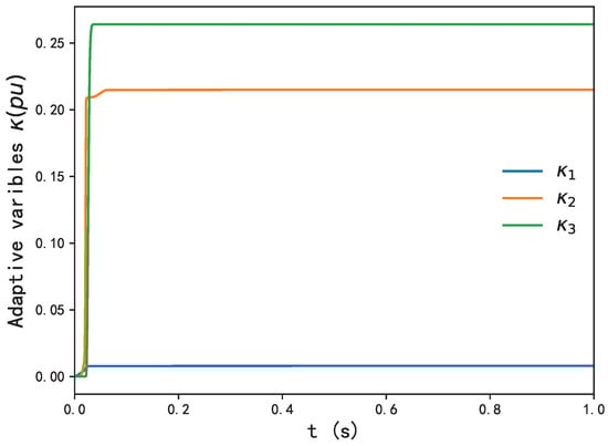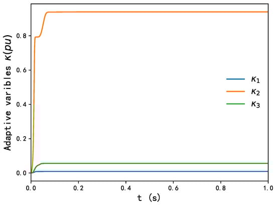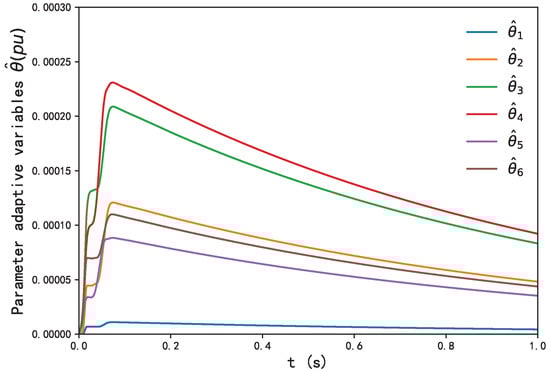 Similarly, Figure 8, Figure 9 and Figure 10 demonstrate that in Case 2, , and converge to zero, while , and converge to their desired references. With the conventional method, however, the convergence rate is much slower compared with proposed controller. Figure 12 shows are always positive if its initial values are non-negative. Again, adaptive laws containing , and converge to stability with the proposed controller in Figure 11. Figure 8, Figure 9, Figure 10, Figure 11 and Figure 12 show the effectiveness of varying the parameters of the generator , and on the response of , and , which is directly related to the output active power and reactive power of DFIG-WT, and the performance with variation of parameters is effective for its swift convergence to the desired trajectory compared with the conventional backstepping controller.