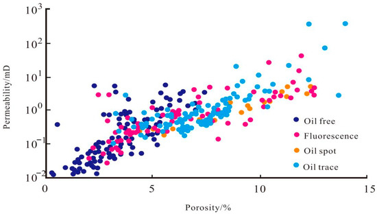 According to the previous development experience of tight sandstone reservoirs in China, the physical properties of effective reservoirs have a good correlation with their oiliness, and in the study of underground oil-bearing reservoirs, the core is the most primitive and closest to the real situation of the reservoir. The research shows that the physical properties of effective reservoirs have a good correlation with their oil content, so we can determine the reservoir PPLLs according to the oil-bearing occurrence of the core. On the basis of the oil test results, the oil-bearing characteristics of the core (oil saturation, oil immersion, oil spots, or oil traces) are defined, and the reservoir is divided into two types, namely oil-bearing and dry layers. According to the oil-bearing characteristics, the permeability and porosity data of the core of the oil-bearing and dry layers are statistically classified, the physical property boundary of the two types of reservoirs is divided, and then the physical property parameters of the core samples are tested, the corresponding relationship between oil occurrence and physical property parameters of core is established, and the relationship between oil-bearing characteristics and porosity parameters is drawn. Finally, the PPLLs are determined according to the relationship diagram [36,37]. This method only needs single-layer oil test results and corresponding porosity and permeability values to obtain the PPLLs and does not require formation pressure, flow pressure, or other data. This method has the advantages of simplicity and strong operability and is especially suitable for areas with few formation test data.