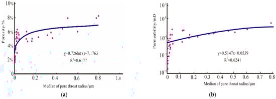 Cross plots of pore-throat radius vs. porosity and permeability [27]: (a) Relationship between the median radius and porosity; (b) relationship between the median radius and permeability.