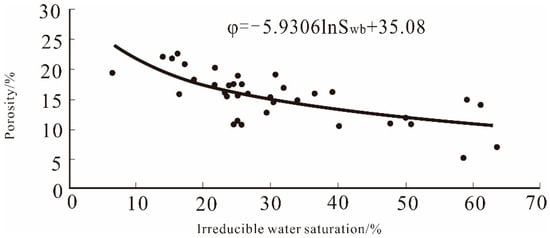 With the porosity corresponding to the irreducible water saturation of 80% as the lower limit of porosity, Wang, Y.Z. et al. [56] established the functional relationship between the porosity and irreducible water saturation of the Paleogene reservoirs at a depth of 3.0–3.2 km in the Dongying sag. Then, they verified the results by combining other methods for determining PPLLs and determined the lower limit of porosity at 9.09% (Figure 6).