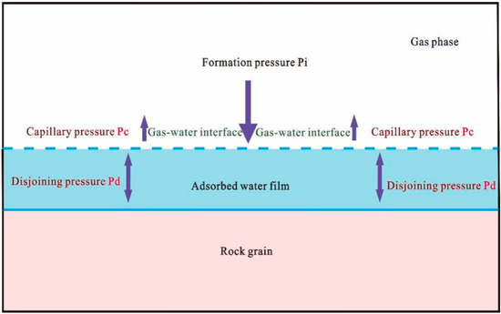 where Pd is the disjoining pressure, MPa; r is the pore throat radius, m; Pi is the formation pressure, MPa; is the gas-water interfacial tension, N/m; Pc is the capillary pressure, MPa; is the wetting angle, °; and h is the water-film thickness, m.