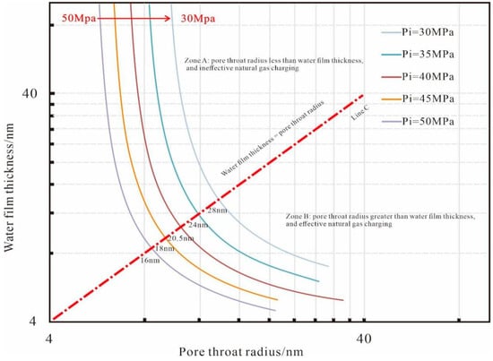 As shown in Figure 8, according to the relationship between water-film thickness and throat radius, natural gas accumulation can be divided into two regions, namely ineffective charging zone A and effective charging zone B. In zone A, the throat radius is less than the water-film thickness, and ineffective natural gas charging occurs under different formation pressures. In zone B, the throat radius is greater than the water-film thickness, and effective natural gas charging occurs under different formation pressures. Line C represents the critical PPLLs for natural gas charging when the throat radius is equal to the water-film thickness under different formation pressures. As shown by the intersection points of line C and the curves of different formation pressures, when the formation pressure rises from 30 MPa to 50 MPa, the critical water-film thickness shows the opposite trend, decreasing from 28 nm to 16 nm. Accordingly, the minimum throat radius for natural gas charging gradually decreases. This method has been applied to many oil fields in China. Compared with the conventional methods, this method incorporates certain innovations both in principle and experimentally. In particular, this method was applied to the deep, tight sandstone gas reservoirs in the Longfengshan area of the Songliao Basin, determining the PPLLs of the reservoirs in the Bei-210 well area and the reserves of the Bei-210 block. However, this method still has some problems in the calculation of some parameters (e.g., interfacial tension) and the analysis of its theoretical applicability. Therefore, it is necessary to further improve this method through fine-scale investigations based on the existing progress.