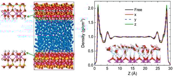 Presently, molecular simulation has been preliminarily applied in the study of water films and their structures (Figure 9). De Almeida and Miranda found that the water films on quartz surfaces significantly affected water–oil displacement [69]. Specifically, the water films blocked the direct contact between the oil phase and pore surfaces but significantly reduced the displacement pressure, whereas pores without water films required extremely high displacement pressure. Afterward, De Almeida and Miranda compared the displacement effects of pores bearing pure water and those containing water with a certain salinity, discovering that salt ions in water led to thickened water films, which reduced the actual size of pore throats and blocked oil displacement [70]. Raiteri et al. and Sedghi et al. [71,72] discovered that the water molecules on calcite surfaces showed a highly ordered arrangement; their dense distribution indicated that the water films on calcite surfaces exhibited the characteristics of multilayer adsorption, and the water molecules in highly ordered arrangements blocked the electrostatic interactions between them and oil molecules and increased the interfacial tension between oil and water accordingly. Zhang et al. [73] found the effect of the pore size on the thickness of the adsorbed water films in quartz nanopores. In other words, the water-film thickness increased with an increase in the pore size. They also found that small quartz pores contained only a monolayer of absorbed water, while large quartz pores contained multilayers of absorbed water, and that the water-film thickness in quartz nanopores was significantly less than that determined in previous studies. Liao et al. [74] found that the water in clay nanopores also exhibited the characteristics of multilayer adsorption and that the water-film thickness could be characterized using the density distribution of water. As indicated by the above-mentioned studies, the molecular simulation method can reveal the characteristics of the occurrence of water films and water–rock interactions at the microscopic level, and the water-film thickness of tight reservoirs can be investigated by establishing an appropriate geologic model so as to gradually improve the problems existing in the water-film-thickness method and break through the existing limitations.