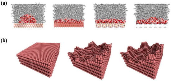In addition, the change in rock wettability significantly affects the wetting angle and adsorption characteristics (Figure 10a) and inevitably has a great influence on the water-film thickness [75]. Underwood and Li et al. found that the density of water molecules in water- and oil-wet nanopores in kaolinites showed the characteristics of multilayer adsorption [76]. Compared with the oil-wet nanopores, the water-wet nanopores exhibited higher water-density peaks that varied over a wider range, indicating thicker water films in the water-wet nanopores. Based on the wetting angles of water on mineral surfaces, Mohammed and Gadikota found that the hydrophilicity of different minerals was in the order of quartz > calcite > illite [77]. However, Chang et al. [78] discovered that the hydrophilicity of mineral surfaces was in a different order: gypsum > calcite > quartz. The different orders might be related to the different molecular force fields they used. Temperature and pressure also affect the motion and distribution structure of water molecules, hydrogen bonding, and the structure of water films in sequence, thus changing the water films’ thickness. Almost all the recent studies of molecular simulation focus on atomic-scale smooth surfaces [79]. However, actual mineral surfaces exhibit varying degrees of roughness (Figure 10b). Some studies have shown that roughness significantly affects the viscosity and diffusivity of fluids [80]. Therefore, the effect of roughness on water films cannot be ignored. Overall, the study of water films based on molecular simulation still faces many critical problems, such as the modeling of typical rocks, the accurate selection of a force field, and the methods for determining water-film thickness. Therefore, there is an urgent need to conduct further relevant studies.