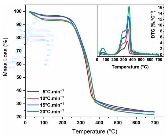 Thermogravimetric curves (TG/DTG) of energy cane bagasse under an inert atmosphere (N2, 50 mL·min−1) at heating rates of 5, 10, 15 and 20 °C min−1.