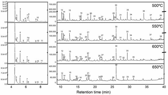 Total ion chromatograms (TICs) of the pyrolysis of energy cane bagasse at 500, 550, 600 and 650 °C. For compound identification number see Table 2.