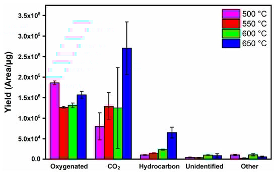 To explore the effect of temperature on pyrolysis products, the compounds were initially grouped into CO2, oxygenated, hydrocarbon, unidentified (similarity less than 85%) and others (nitrogen and sulfur compounds) (Figure 3). The increase in temperature decreased the formation of oxygenated compounds and increased the production of CO2 and hydrocarbons, indicating the occurrence of decarboxylation reactions [].