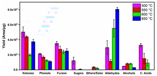 The high yield of oxygenated compounds is due to the high oxygen content in the composition of energy cane (~44.2%). These compounds are grouped according to their organic functions in Figure 4, as a result of the degradation of holocellulose (hemicellulose + cellulose) (~70.4 wt.%) and lignin (~18.4 wt.%).