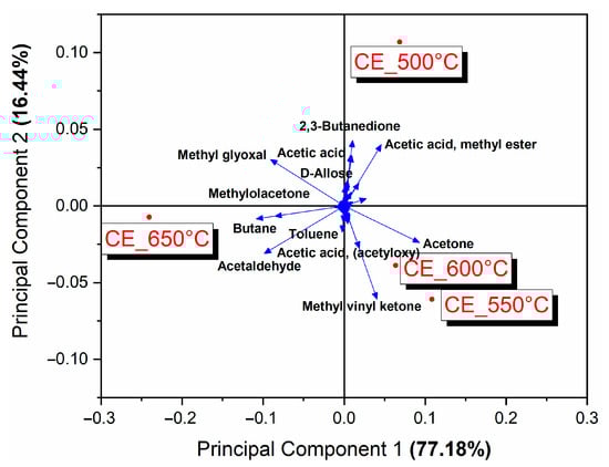 The effect of temperature on the distribution of the products was assessed using principal component analysis (PCA), shown in Figure 5. The two principal components (PCs) together explained 94% of the variance of the data, with PC1 directly linked to temperature and explaining around 77% of the data variation. Figure 5 shows that the pyrolysis at 500 °C differed from the others in having high yields of D-allose, 2,3-butanedione and acetic acid methyl ester, which are compounds resulting from the degradation of holocellulose at low temperatures. The pyrolysis performed at 550 and 600 °C were similar to each other and favored the formation of methyl vinyl ketone, acetone and acetic acid, products resulting from secondary reactions of the holocellulose. Hydrocarbons such as toluene were also favored. In the pyrolysis at 650 °C, the favored products were methyl glyoxal, methylolacetone, acetaldehyde and hydrocarbons such as butane and toluene.
