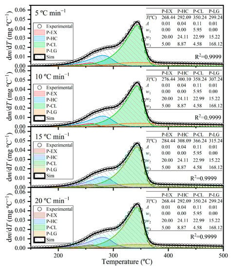 The Asym2Sig fitting function was used to perform a multi-peak differentiation on the DTG curves. This yielded four independent devolatilization reactions (pseudo-extractives, pseudo-hemicellulose, pseudo-cellulose and pseudo-lignin), as shown in Figure 6. The excellent adjustment obtained with coefficients of determination (R2) greater than 0.99 for all heating rates confirmed that the pyrolysis behavior of energy cane bagasse was well characterized by these four independent devolatilization reactions. A qualitative similarity was observed between the profiles of the four individual devolatilization reactions identified in this study and those reported by Da Silva et al. [] for the pyrolysis of sugarcane bagasse, which employed a four-component model. The fractional contribution (Ci) of each independent devolatilization reaction in the pyrolysis behavior of energy cane bagasse was determined as follows: 0.0410 for pseudo-extractives, 0.2773 for pseudo-hemicellulose, 0.5760 for pseudo-cellulose and 0.1057 for pseudo-lignin.