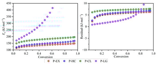 Figure 7 illustrates the dependence of the activation energy on the extent of conversion for each of the pseudo-components by the FR method. The average values of Ea were 135.6, 147.4, 179.2 and 512.4 kJ mol−1 for the decomposition of, respectively, pseudo-extractives, pseudo-hemicellulose, pseudo-cellulose and pseudo-lignin. The calculations were carried out within a conversion range of 0.05–0.95 at 0.001 intervals. The average values of the coefficient of determination were all higher than 0.96, indicating reasonably credible calculations for obtaining the dependence of activation energy on the conversion extent through the four isoconversional methods.