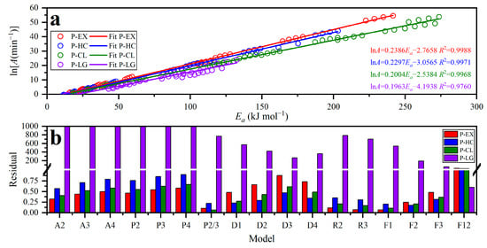 As discussed earlier, the pyrolysis of energy cane bagasse consists of four parallel devolatilization reactions. A strong linear relationship was found between the activation energy, determined through the Friedman isoconversional method, and the pre-exponential factor (in its natural logarithmic form—ln(A)) for each pseudo-component. This relationship was supported by a high correlation coefficient (R2 > 0.96 for all devolatilization reactions), as presented in Figure 8a. The occurrence of the compensation effect in the pyrolysis of energy cane bagasse supports the reliability of this method in estimating the pre-exponential factors that represent the kinetics of pyrolysis reactions.