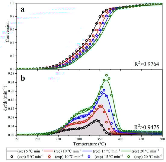 The multi-component kinetic analysis enabled the determination of one kinetic triplet for each pseudo-component, resulting in the overall kinetic expression (Equation (14)) for practical applications, such as reconstructing the experimental pyrolysis behavior. In order to verify the precision of the overall kinetic expression, the reconstructed curves obtained from it were compared to the experimental conversion and conversion rate curves, as per the guidelines proposed by the ICTAC kinetics committee for analyzing multi-step kinetics from overlapping reactions []. This verification is crucial to ensure the usability of the obtained overall kinetic expression in the design and simulation of the pyrolysis of energy cane bagasse.