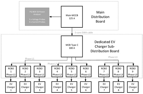 The measurements required to carry out the PQ analysis for this study were taken on a commercial EV charging setup with nine individual single-phase chargers rated at 7 kW (nominal voltage 230 V RMS, expected peak current 30 A RMS), as shown in Figure 1. The nine chargers were distributed with three for each phase. The dedicated EV charger sub-distribution board was protected by a 100 A Type C miniature circuit breaker (MCB) and nine individual 32 A 30 mA residual current breakers with overload (RCBOs), with one for each charger. The data was collected at the main distribution board on/after the EV circuit 125 A molded case circuit breaker (MCCB) using an A-Eberle PQ-BOX 50 instrument, which is suitable for individual voltage/current harmonic analysis up to the 50th harmonic.