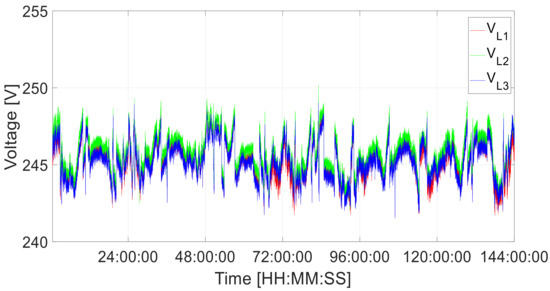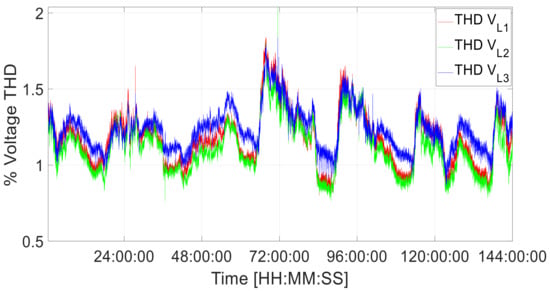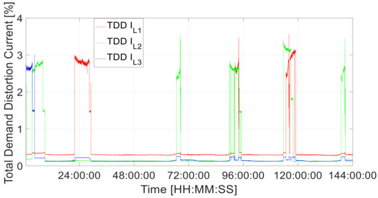 The total demand distortion (TDD) for the system voltages is shown in Figure 6. The mean and maximum THD values for the period shown are listed in Table 4. All values are within the 5% TDD limit specified in IEEE 519-2014 [26], assuming the most stringent level of ISC/IL < 20. The highest values were observed for L1, with a mean of 0.52% and a maximum of 3.57%.