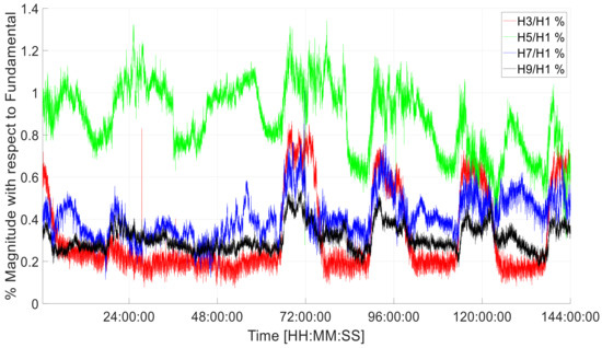 The harmonic voltages in phase L1 divided by the fundamental voltage expressed as a percentage are shown in Figure 4 for h = 3, 5, 7 and 9. These harmonics were observed to be the most significant contributors to the THD. Similar results were observed for phases L2 and L3. The mean and maximum values for the period shown are listed in Table 3. The maximum values were observed on the fifth harmonic, with a mean of 0.88% and a maximum of 1.34% of the fundamental. However, all values were within the 5% limit individual harmonic level specified in IEEE 519-2014 [26].