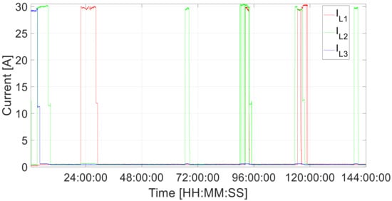 Three-phase system current results for IL1, IL2 and IL3 in [A] vs. time for 6 days, as measured on a commercial EV charging setup.