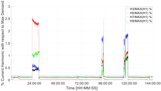 The harmonic current for phase L1 divided by the maximum current demand expressed as a percentage is shown in Figure 7 for h = 3, 5, 7 and 9. These harmonics were observed to be the most significant contributors to the TDD. Similar results were observed for phases L2 and L3.