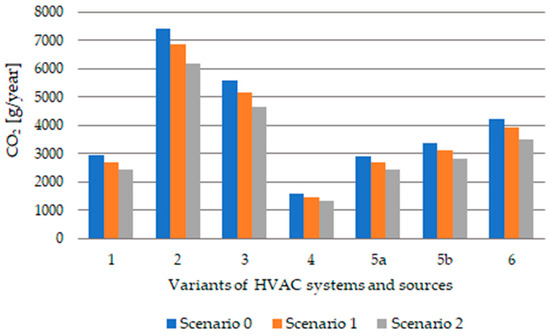 - A reduction in CO2 emission as the result of climate warming is visible for systems with low efficiency and high emission factors (V.2), while in the case of eco-friendly solutions (such as the GHP in V.4) any reduction is inappreciable.