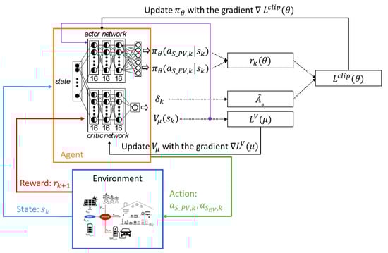 Proximal policy optimization (PPO) belongs to the family of value-based and policy gradient algorithms. PPO is a model-free RL algorithm focused on policy gradient optimization where the policy is updated in each iteration using the clipping and subrogate function. One of the advantages of the PPO is that its formulation helps to maximize exploration in the learning process without increasing the computational complexity of the algorithm. The policy is updated by the policy gradient theorem to increase the expected reward. In PPO, the agent is composed of critic and actor modules (actor–critic). The actor’s objective is to determine the optimal policy, considering the environment, to maximize the reward. Therefore, the actor module is responsible for generating the action of the system, , represented by the policy , and parameterized by . The critic module estimates the value function of the state of the system () (Figure 3)—that is, the critic module evaluates the agent action by means of the value function parametrized by . To estimate the expected cumulative reward, the critic module uses the Q-value function. The critic’s output value is used by the actor to adjust policy decisions, leading to a better return.