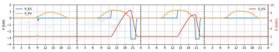 In Equation (2), at the PV node, the PV panels provide energy to the residential house () when there is sunlight (). The excess PV produced is stored in the BESS () and can be used to provide energy to the house for hours without PV production.