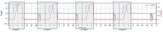 - The charge/discharge action determines, for each time slot, the amount of bidirectional energy flow between the PV generation and its associated storage unit (BESS). For the case of CAEV, the charging/discharge action for EV batteries is limited by the maximum charging/discharging power that could flow through the EV battery socket. When the action’s value is zero, there is no power flow between the charging socket and the battery. Both actions () are continuous and are measured in kW.