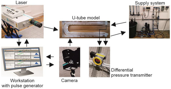 Experimental tests following the numerical calculations were carried out using the PIV method for analogous geometric and flow assumptions as in the numerical studies (Table 1). The u-tube models were cored from transparent PMMA material. In order to avoid barrel distortion generated by curved surfaces [34], the u-tube models had a rectangular cross-section, and the execution in them by the cavity method of an internal channel with a diameter of d = 0.007 m made it possible to realize the flow as in a classical u-tube. A similar solution was presented in the work [35]. Liquid supply was carried out through the upper port of the u-shaped element and liquid outlet occurred in its lower port. The stubs were connected to the pumping system and the tank so that the movement of the liquid took place in a closed circuit. An ENKO MPP-05C electromagnetic flow meter was responsible for measuring the fluid flow. In addition, a Peltron PXWD-0.2 differential pressure transducer was used to measure the pressure drop between the inlet and outlet ports of the test unit. The temperature of the liquid during the experimental study was measured and varied between 20.1 and 20.4 °C (inlet of the tank). Thus, it was assumed that there was no temperature gradient that could affect changes in the nature of the fluid flow. A constant temperature value in the laboratory and a fluid distribution system with a large volume (190 dm3) in relation to the volume of circulating fluid were certainly responsible for this situation. The optical path of the test rig was formed by a Dantec Dynamics FlowSense EO 4M CCD camera positioned perpendicular to the test object and the laser light sheet generated by the Dantec Dynamics DualPower TR laser (optical knife technique). The camera was equipped with an Omega Optical 550LP narrow-band filter to facilitate imaging of light generated by fluorescent markers. A Berkeley Nucleonics Corp model 575-8 pulse generator was responsible for synchronizing the camera and laser. Control of the equipment and acquisition, data processing, and performance of the necessary PIV calculations were carried out in the Dantec Dynamics Dynamic Studio environment.