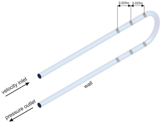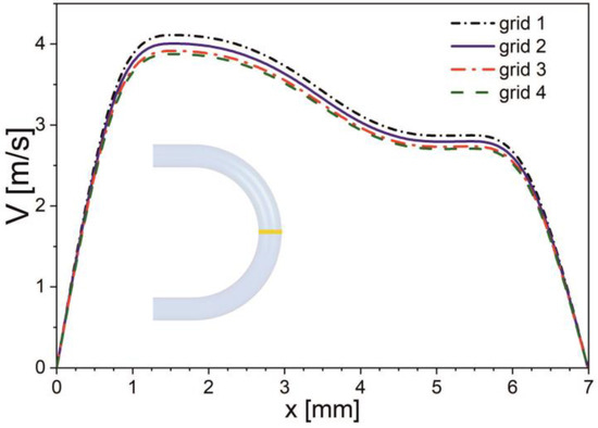 The study was conducted for the 3D computational domain. Three geometries were generated, corresponding to the bending radii of the u-tube shown in Table 1. Due to the fact that a key element of CFD studies is the discretization of the computational domain, an analysis of the sensitivity of the mesh density to the results obtained was carried out. This study was conducted for a u-tube with a bending radius of rg = 0.023 m (Figure 2; the figure additionally includes the location of the planes for which the analysis was conducted in Section 3). A variable-density (hexagonal) grid was used. Four grid densities ranging from about 4 × 105 to about 1.2 × 106 elements were generated. Sensitivity analysis was carried out in terms of average in-plane velocities in the axis of symmetry of the elbow (for Q = 0.5 m3/h). The values of average velocities were, respectively: grid 1 (401,289 elements): 3.772 m/s; grid 2 (521,487 elements): 3.711 m/s; grid 3 (606,732 elements): 3.629 m/s; grid 4 (1,119,562 elements): 3.621 m/s. The difference between the minimum and maximum values was about 4%. It was found that an increase in grid density did not have a large effect on the obtained results. In addition, Figure 3 presents the velocity profiles at the axis of symmetry of the elbow (the exact location is marked in Figure 3 with a yellow line) for the four grid densities. It was found that the profiles for grids 3 and 4 follow a similar trend, and there are few differences. Therefore, the grid density corresponding to grid 3 parameters was used for further studies (Figure 4). This reduced the time consumption of the CFD testing process. For the remaining u-tube with different bending radii, discretization parameters corresponding to grid 3 density were assigned.