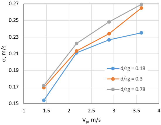 An important part of any measurement method is the determination of measurement accuracy. The PIV method is complex in this aspect, however, based on the assumptions presented in the work [36], it can be stated that the most significant contribution to this aspect is the estimation of the seeding particles displacement uncertainty σ, as this parameter directly affects the value of the found velocity vectors. To better illustrate the uncertainty σ, it is directly converted into a unit of velocity. The uncertainty distributions obtained during the study are shown in Figure 6. They were determined based on the Peak Height Ratio as proposed in the work [38], and, taking into account the cumulative Rayleigh distribution function, it can be found that 95% confidence was obtained that the measured velocity differs from the true value by, at most, σ. The uncertainty σ increases as the flow velocity increases and reaches a maximum value of 0.269 m/s for the elbow with the largest bending radius, which is due to the largest velocity values measured in this geometry.