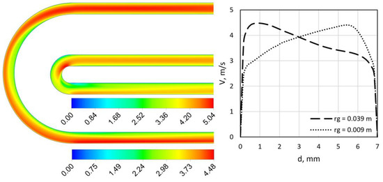 When analyzing the local nature of the flow, the focus was on evaluating the velocity profile in the axis of symmetry of the bend section of the u-tube. There was a characteristic profile distribution in all analyzed variants. During the analysis, a strong correlation of the velocity profile distribution with the rg value was detected. The localization of the areas with the highest and lowest fluid velocity for extreme values of rg was reversed (Figure 8). For the largest bending radius, the maximum velocity was recorded at a distance of 0.5 mm from the outer wall, while for the smallest bending radius the maximum velocity was recorded in the area closer to the opposite wall of the bend. Counting from the outer wall of the bend, this distance was 5.5 mm. The distribution of fluid flow velocity depending on rg is characterized by the spatial inversion of fluid streams, which is close to a symmetrical distribution. This fact should be noted, especially in the aspect of evaluating the erosive action of the flowing fluid. Thus, the location of areas threatened by an increase in the intensity of erosive processes is directly related to the position of the u-tube in the tube bundle.