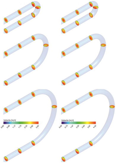 In the literature, one can find papers indicating a significant change in the nature of the flow depending on the imaging plane. Based on the observations of Mariotti et al. [39,40], visualization of the flow in several planes was carried out (see Figure 2). The CFD method was used. For the results obtained along the u-tube (Figure 9 and Figure 10), clear fluid maldistribution structures were observed in cross-sections. The maldistribution phenomena are permanent and hold with the course of the u-tube (developing and disappearing depending on the flow velocity and bending radius). This confirms previous observations indicating that the symmetrical distribution of velocity in a straight inlet section is disturbed by the presence of a bend in every case analyzed. It should be considered as a point that initiates the movement of a stream with increased flow velocity to the outside of the elbow in the case of bending radii rg of 0.039 m and 0.023 m and to the inside of the elbow in the case of bending radius rg = 0.009 m.
